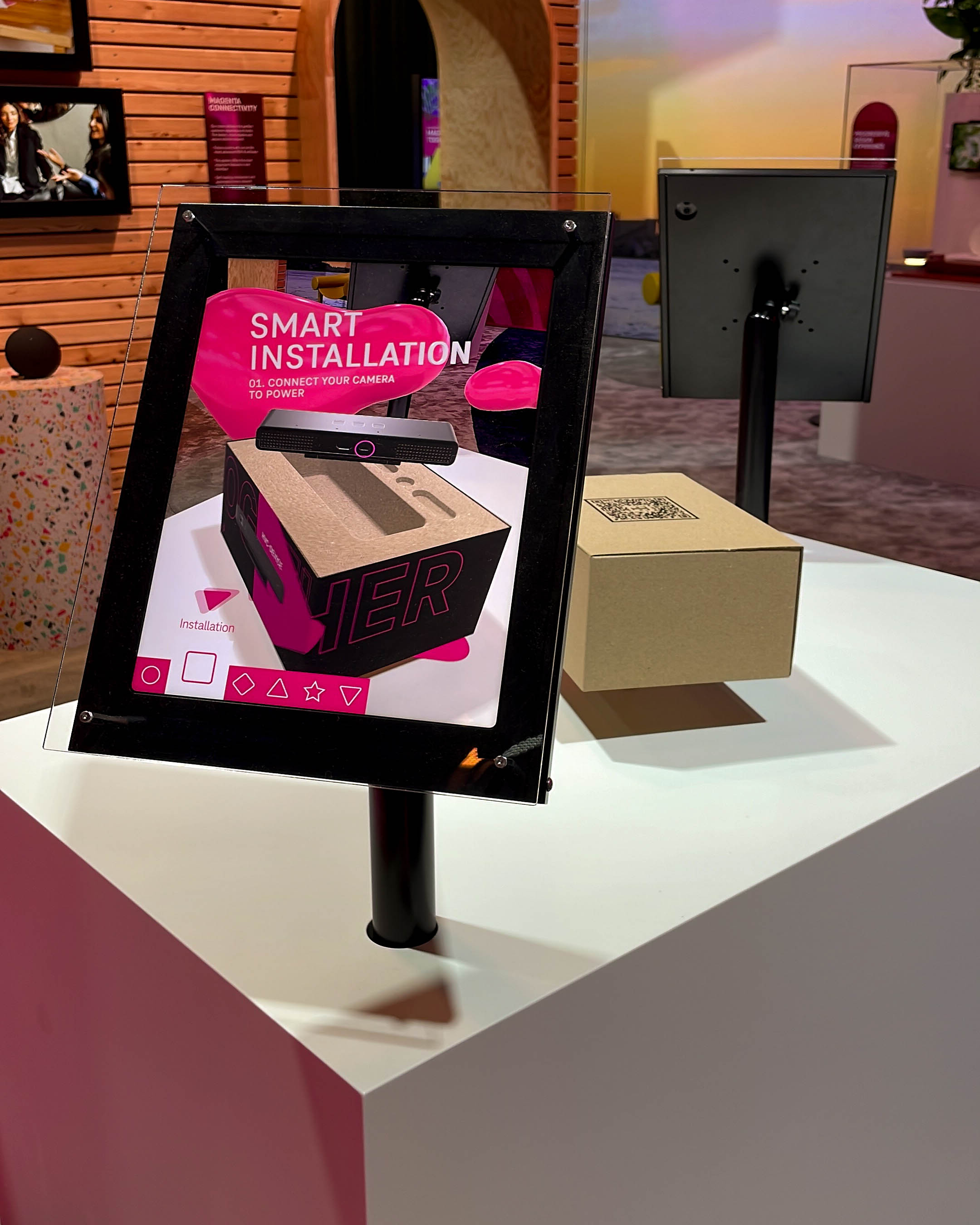 Da durch die Pandemie nicht genau bekannt war unter welchen Auflagen die Messe stattfinden würde, entschieden wir uns zusammen mit der Telekom dafür, die Exponate in diesem Jahr „touchless“ zu gestalten.  Keine leichte Aufgabe, bedenkt man, dass in den Jahren vor der Pandemie der Trend ganz deutlich in Richtung haptischer Interfaces ging. Da auch nicht bekannt war, ob genügend Berater zum MWC reisen können würden, sollten die Exponate sowohl in der Beratungssituation als auch in der Selbstexploration „touchless“ funktionieren. Eine große Herausforderung, da die Arten der Inhaltsvermittlung oft ganz unterschiedlich funktionieren.